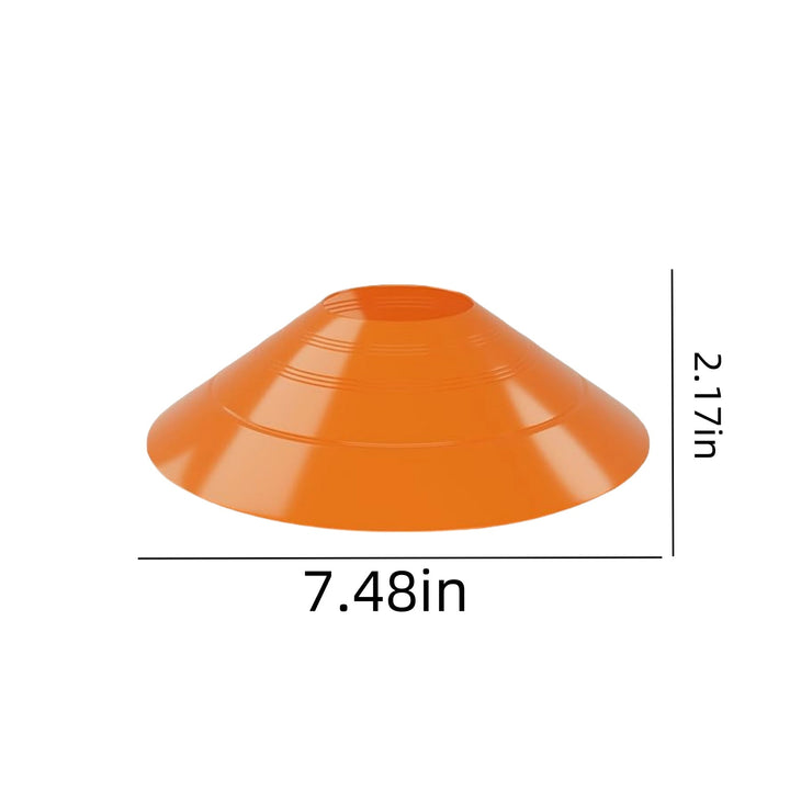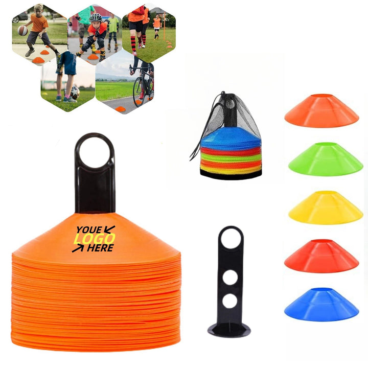 Made of high-strength plastic, these soccer cones can withstand the rigors of play and extreme weather without cracking or breaking, providing long-lasting performance. Vivid and bright colors make these soccer cones highly visible on the soccer field, training field, helping athletes ensure maximum focus during training. Convenient mesh bag with shoulder strap for easy carrying and storage. Suitable for soccer training, agility training, target practice, obstacle training, etc., to meet all your training needs. Product size 7.48" x 2.17", Thickened round mouth logo discs total 50 pieces, with a stand and storage bag, welcome to provide your brand information to customize your logo.