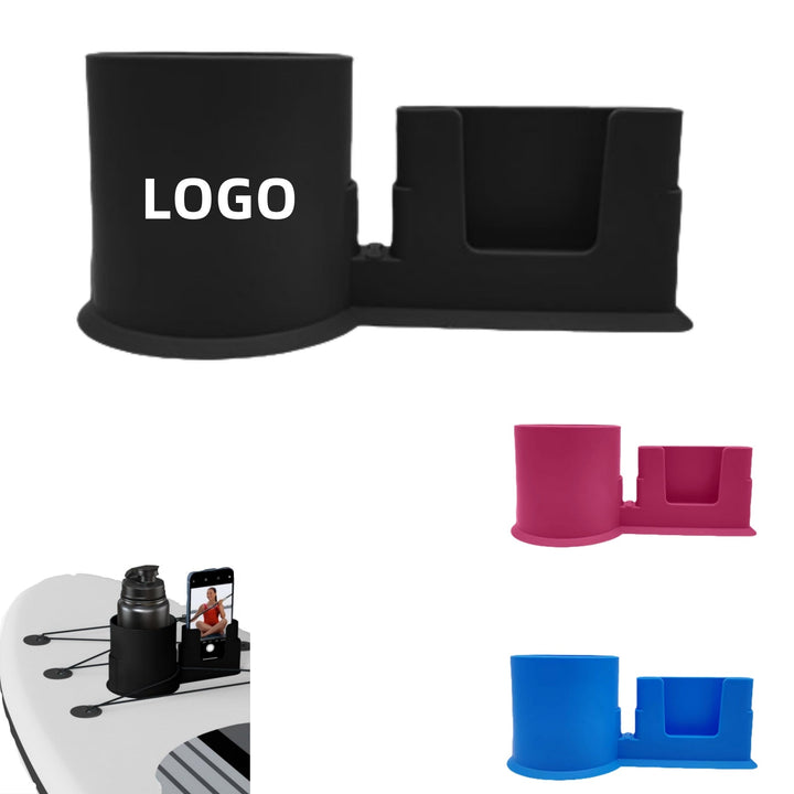 This product is made of polypropylene, durable and heat resistant. It is a multi-functional holder combo, constructed with a cylindrical cup holder and a rectangular mobile phone holder connected together to hold both a water bottle and a mobile phone. Very convenient for activities such as stand up paddle boarding. Customizable with your logo or company name.