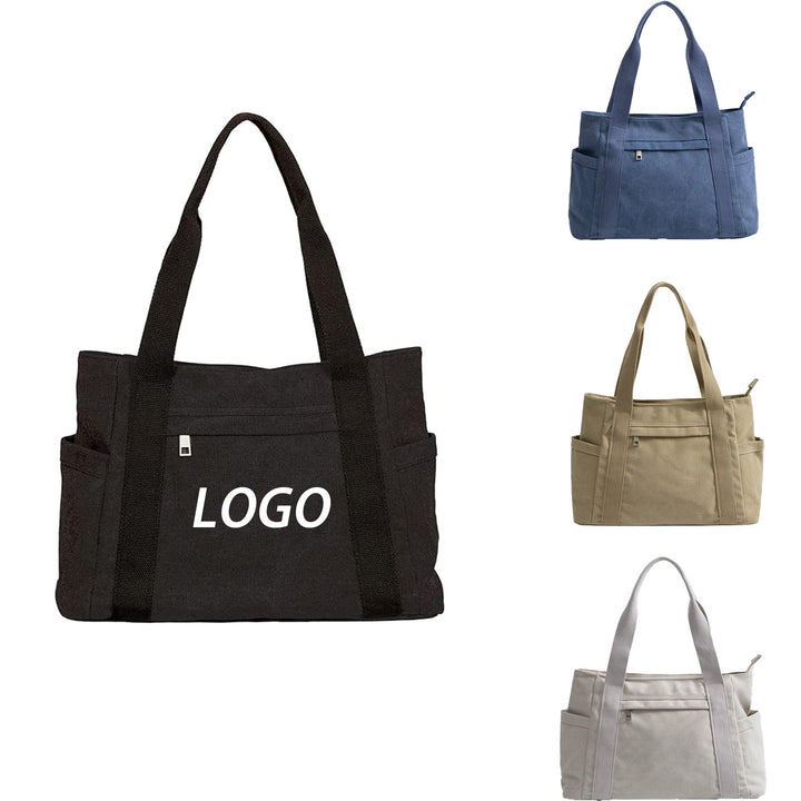 Made from durable canvas material, this bag features a zipper closure that keeps your belongings secure. The well-organized interior includes a zipper pocket, phone pocket, and id pocket, ensuring everything stays in its place. The widened handles are soft yet sturdy, providing a comfortable grip. The high-quality metal zipper has a rich color and smooth operation. The thickened bottom ensures the bag stands upright and maintains its shape. The customizable logo option allows you to personalize the bag with your own design or company logo, making it a perfect promotional item or gift.