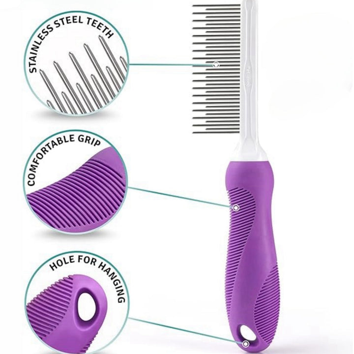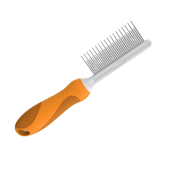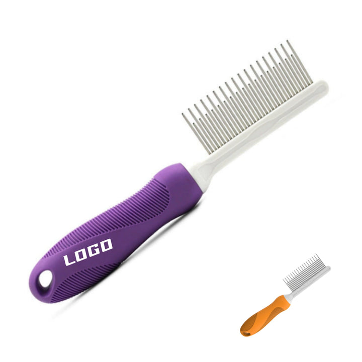 This pet comb is made of TPR coating process and stainless steel, it has long and short steel teeth can easily comb pet hair, remove floating hair, dead hair, massage the skin, and it is small, easy to carry. And you can customize your own logo.