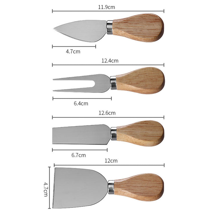 Crafted with high-quality rubberwood and 420 stainless steel blades tested for sharpness and durability, this set includes four essential cheese knives, each with a comfortable rubberwood handle. The sharp blades ensure precise cutting, while the elegant design adds a touch of sophistication to your kitchen or dining table. Available in three color options, this set can match any kitchen decor or personal style. The customizable logo feature allows you to personalize it with your own design or company logo, making it a perfect gift for any occasion.